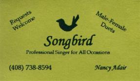 With acclaim and awards from several singing contests around the Bay Area, as well as Los Angeles, Reno, and Ft. Lauderdale, Nancy currently may be seen/heard as a KJ host (that's a karaoke DJ, for those who don't know!) at the Cherry Chase Bowl Lounge in Sunnyvale on Thursdays/Fridays. She sings at weddings and entertains at birthdays, Christmas; in other words - parties!